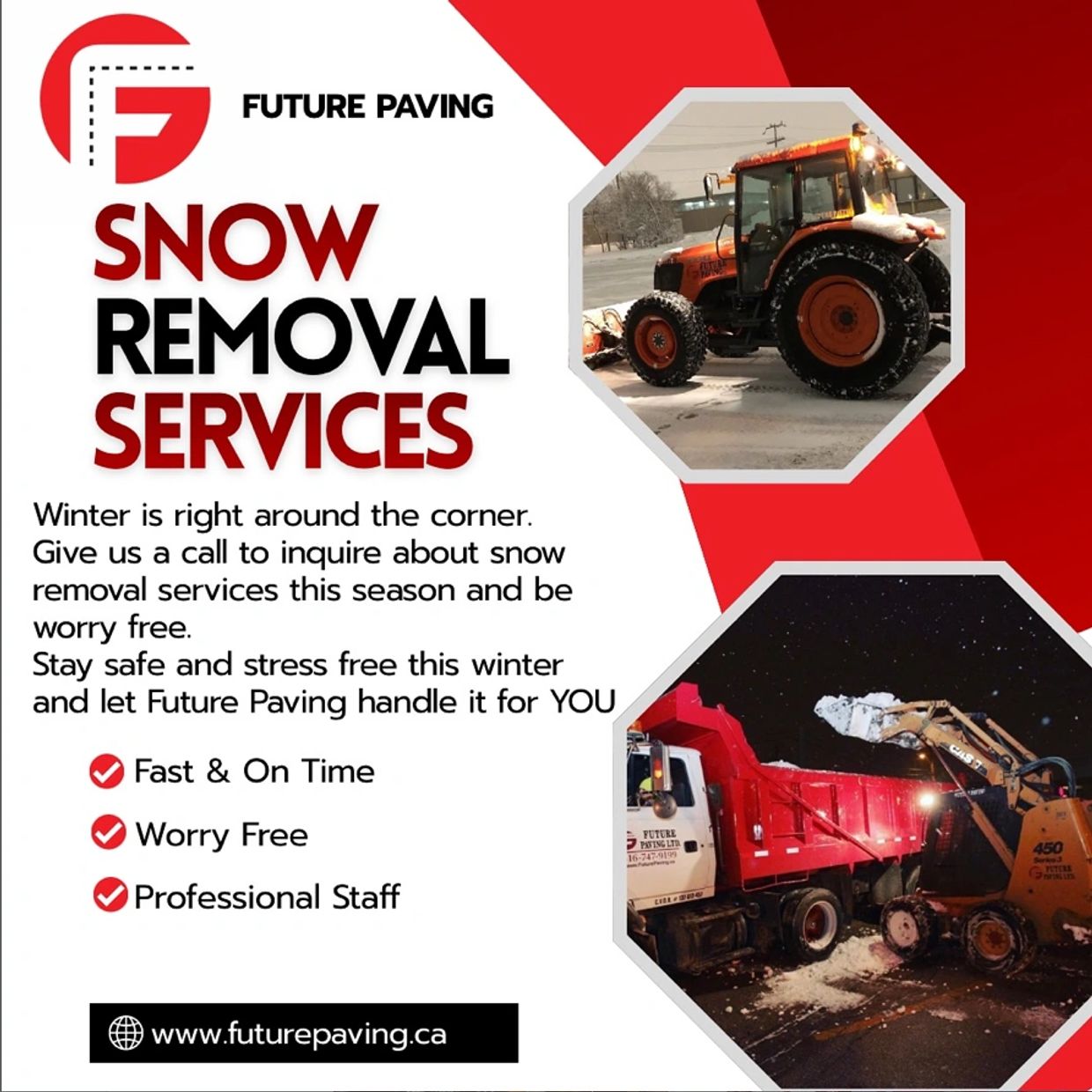 "Keep your property safe and accessible all winter with our reliable commercial snow removal services. At Future Paving, we specialize in timely snow plowing, de-icing, and salting to ensure your parking lots, walkways, and entrances remain clear and hazard-free. Trust our professional team to handle even the toughest winter conditions, so you can focus on running your business."